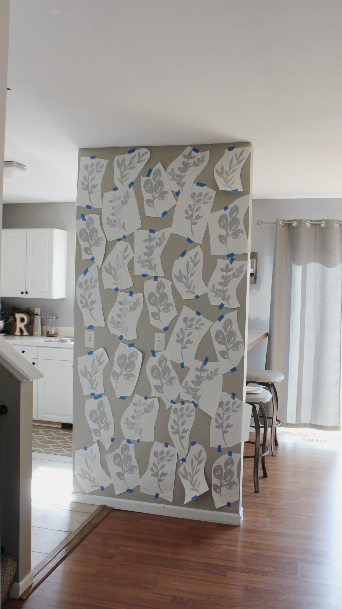 So we have this super awkward wall that is keeping our whole space from being an open concept. I have no intent to knock the wall down because this isn’t our forever home, but I have been thinking over & over again what I could do to this wall to make it more of a fun focal point. I thought about shiplap & painting the wall a completely different color but I am a super indecisive person & didn’t know if I would like the look in the long run! I ended up looking on Pinterest & saw all these amazing accent walls of wallpaper & absolutely loved it!